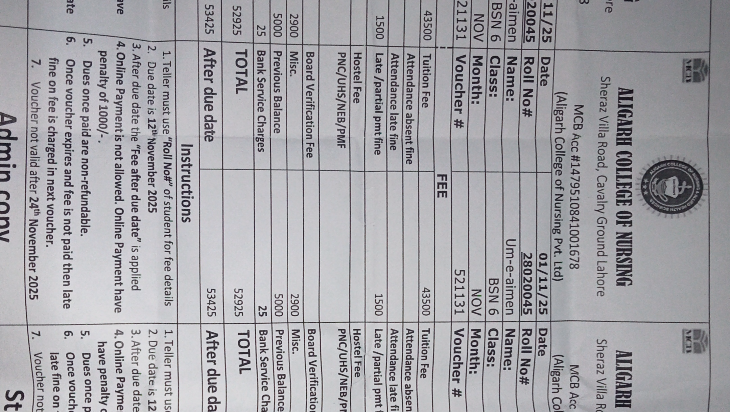 beti ke BS nursing ka fee voucher h jo k abi tk fee naa hony ke waja sa jama ni ho saka